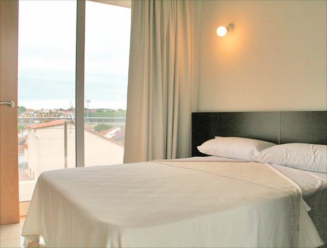 Appartement d'une chambre avec un lit double de 1,50 m avec une fenêtre et un balcon, il dispose également d'un salon-salle à manger, où il y a un canapé-lit, une cuisine intégrée, une salle de bain et une terrasse.